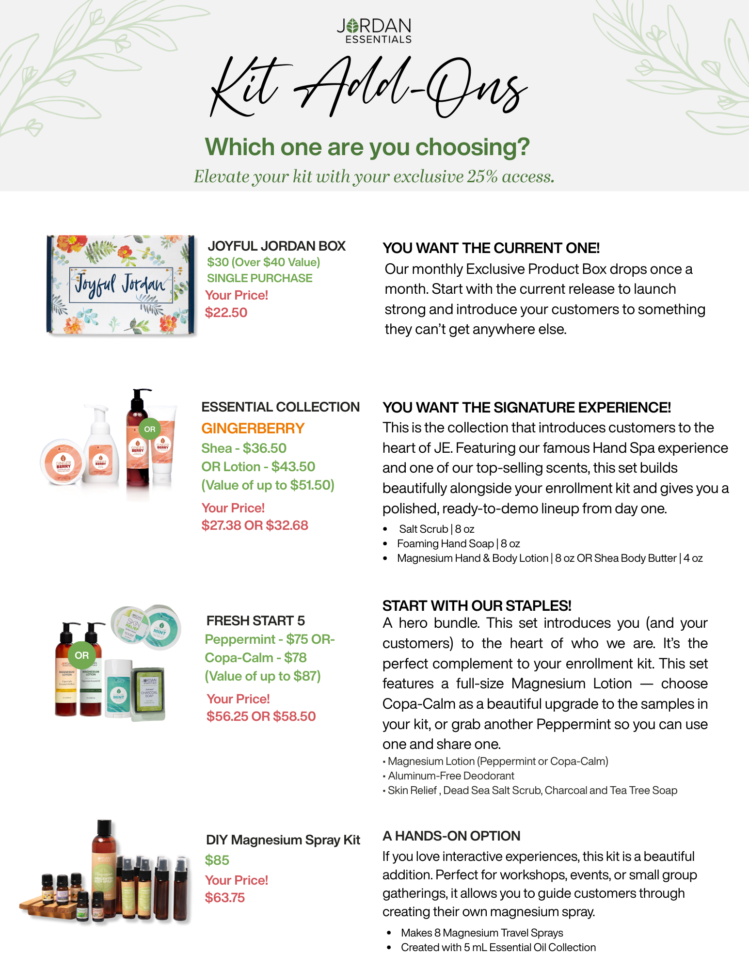 Additionally, you can customize your start as a Jordan Essentials Consultant with our stylized "Journeys” and Add-On Collections: the Health & Wellness Box and Face Care Collections are just a few examples. Each of these add-ons focuses on specific areas to help you build and personalize your business.